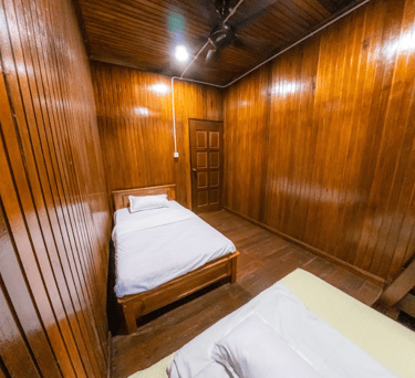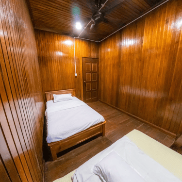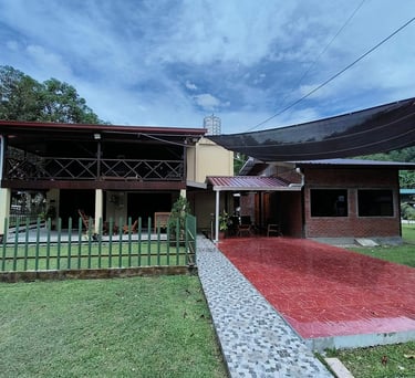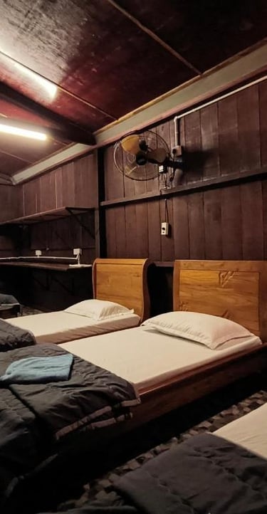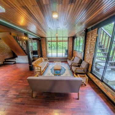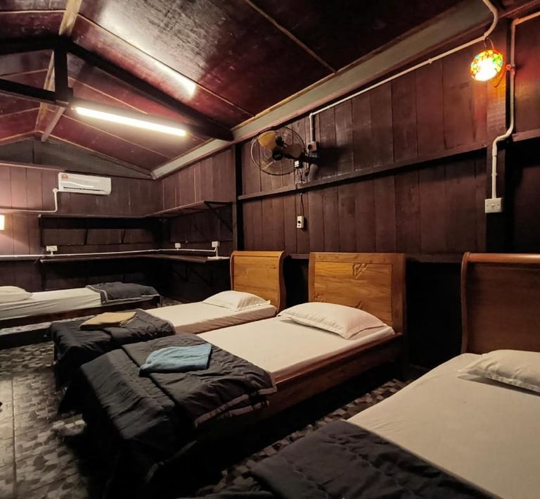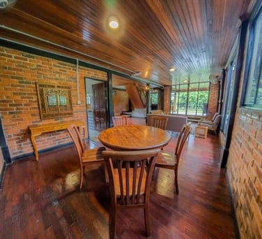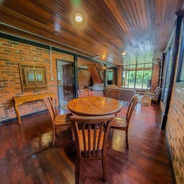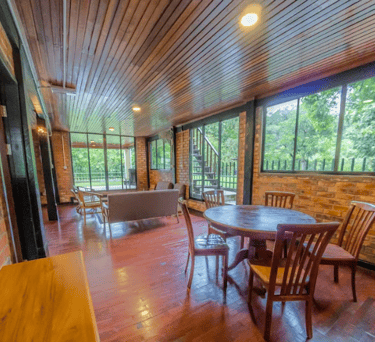 A cozy kampung-style retreat with rich timber finishes, comfortable shared spaces, and calming views of nature that create a homely, laid-back atmosphere.