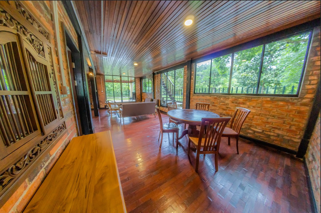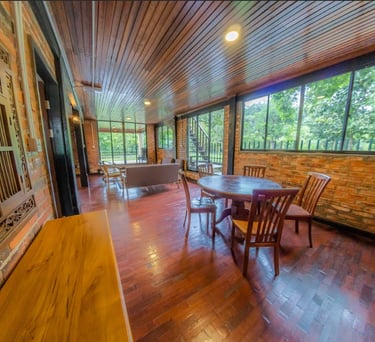 A cozy kampung-style retreat with rich timber finishes, comfortable shared spaces, and calming views of nature that create a homely, laid-back atmosphere.