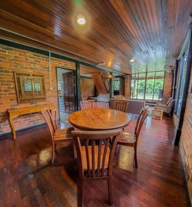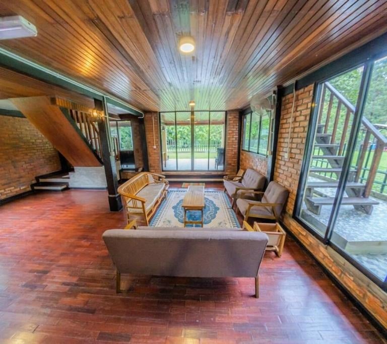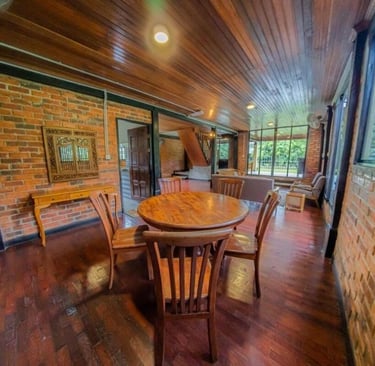 A warm, wood-clad retreat featuring brick accents, an open living and dining area, and large windows that invite natural light and peaceful forest views.